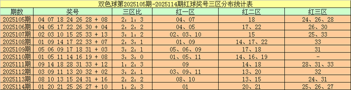 双色球第2025114期奖号为:01 20 21 25 26 27 + 10,红球三区比为1:2:3。